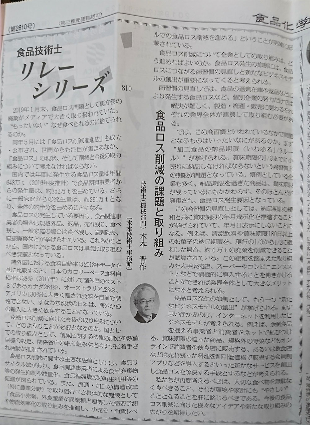 食品化学新聞 食品技術士リレーシリーズに寄稿記事が掲載されました(2019.12.19) 題名「食品ロス削減の課題と取り組み」